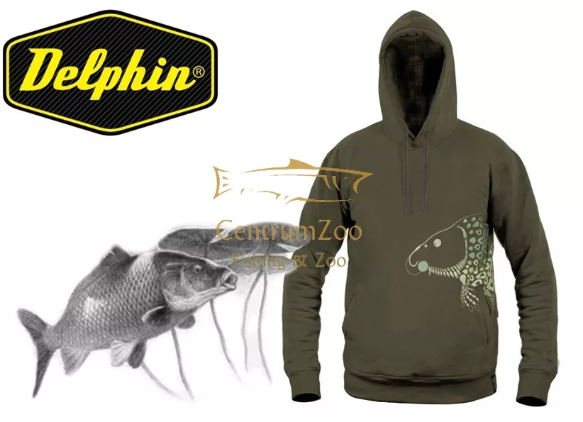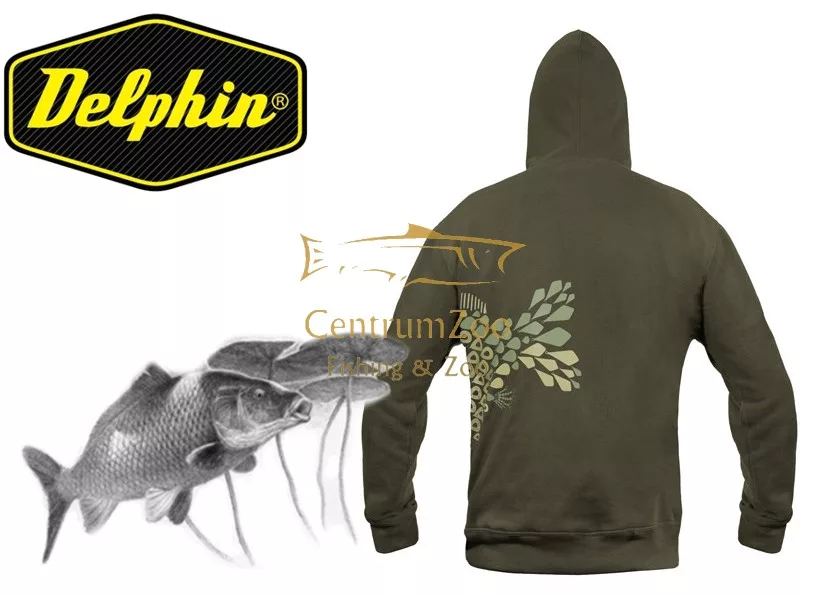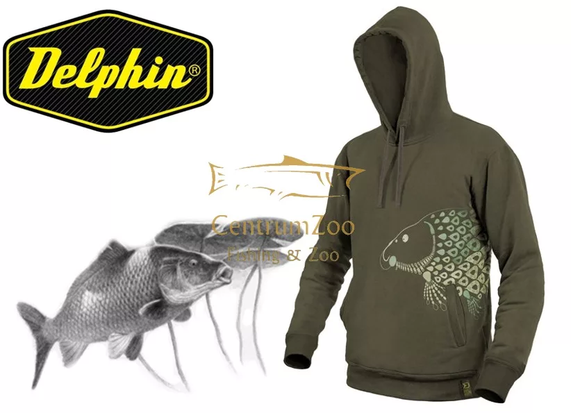 Sötétzöld anyagból készül, amely tökéletesen illeszkedik a természetes környezetbe. A pulóveren ábrázolt ponty motívum teljes egészében a pontyozó szerelékek egyes elemeiből áll, mint a forgók, ólom, előke és hasonlók. Ezáltal a Delphin TACKLE felismerhető és valóban egyedi darab a pontyhorgász ruházatok között. Az elülső részén két zseb található, amelyek lehetővé teszik, hogy hideg időben melegítse a kezét, de különféle dolgokat is tároljon.