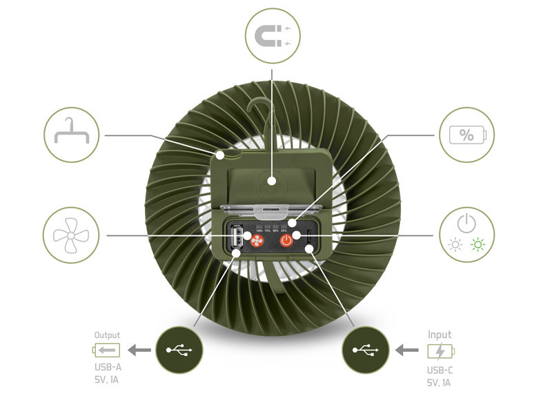 Ez az eszköz praktikus társ bármilyen szabadtéri programon, ahol egyszerre van szükség hűsítésre, világításra és hordozható áramforrásra.