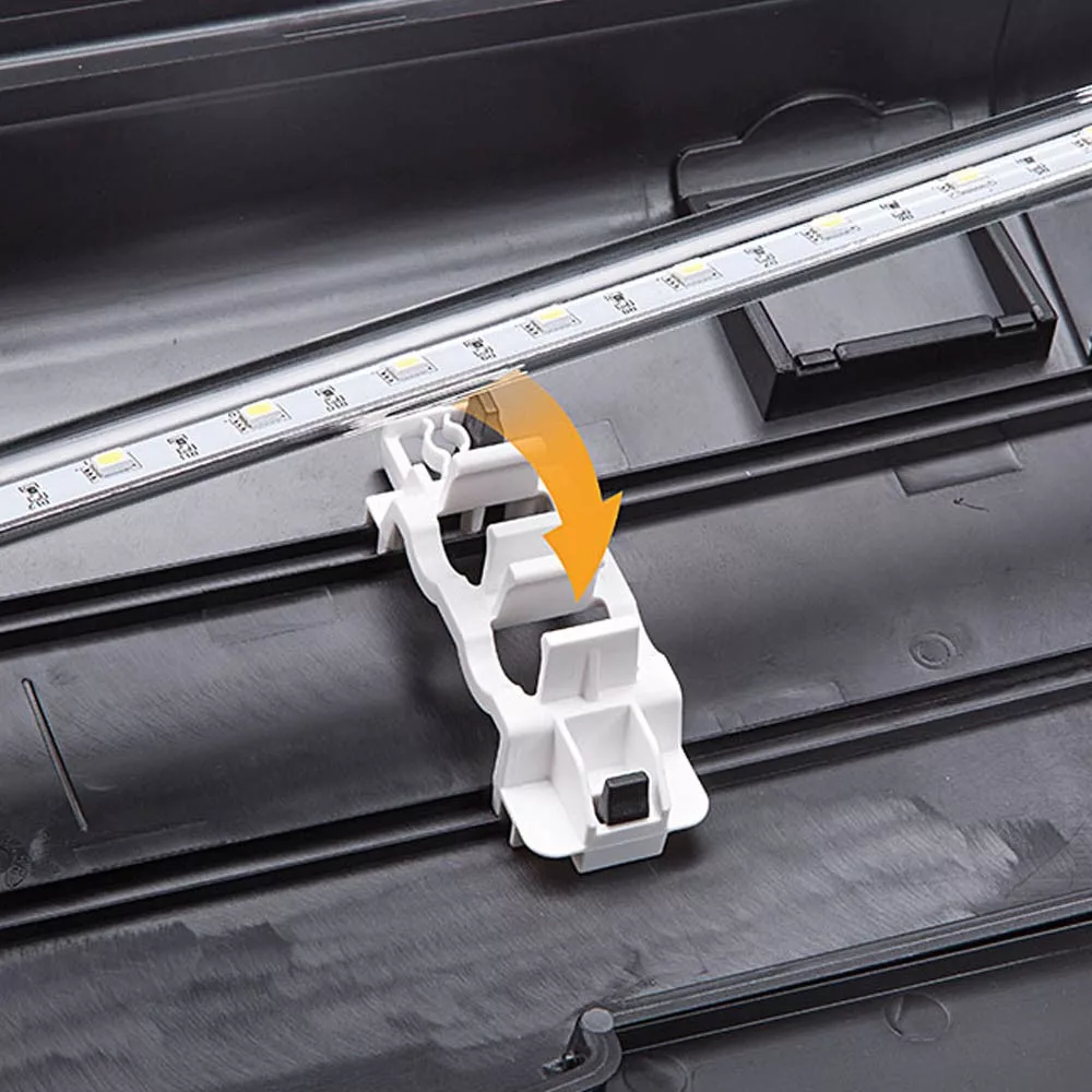 A termékhez két adapter és rögzítőcsavar is tartozik, amelyek lehetővé teszik a LED cső egyszerű felszerelését akár sík felületekre is. A kompakt 1,6 cm-es átmérő és a 92,5 cm hosszúság révén diszkréten beépíthető bármely modern akvárium- vagy terráriumfedélbe.