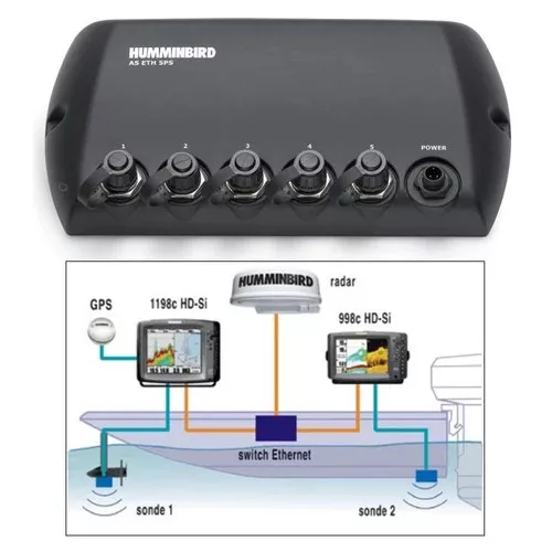 A Humminbird Ethernet 5 port elosztó segitségével különböző kiegészítőket lehet összekötni kedvenc Humminbird halradarjával. Az Ethernet elosztó segítségével akár két képernyő is összeköthető, ráköthető a hajózási radar, külső navigáció vagy akár a 360 SI jeladó is. Kompatibilis modellek: SI 1198c, 1158c, 1158c DI, 998C SI, 958c, 958c DI, 898c SI, 858c, 858c DI, 798ci HD SI, 788ci HD XD, 788ci HD, 788ci HD DI, 778c HD XD, 778c HD. Az elosztó az összekötőkábeleket nem tartalmazza.