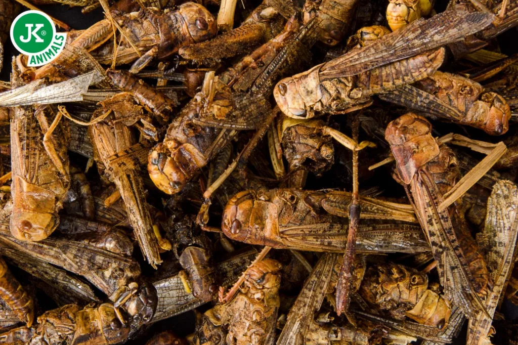 A JK Animals szárított szöcske egy 100%-ban természetes, bio kiegészítő takarmány, amelyet fagyasztva szárítással (-80 °C) állítanak elő, így megőrzi a szöcskék eredeti tápértékét és ízvilágát. Rendkívül magas fehérjetartalmának köszönhetően kiváló választás hüllők, teknősök, halak, madarak, baromfik, sünök, mókusok és minden rovarevő kisállat számára.