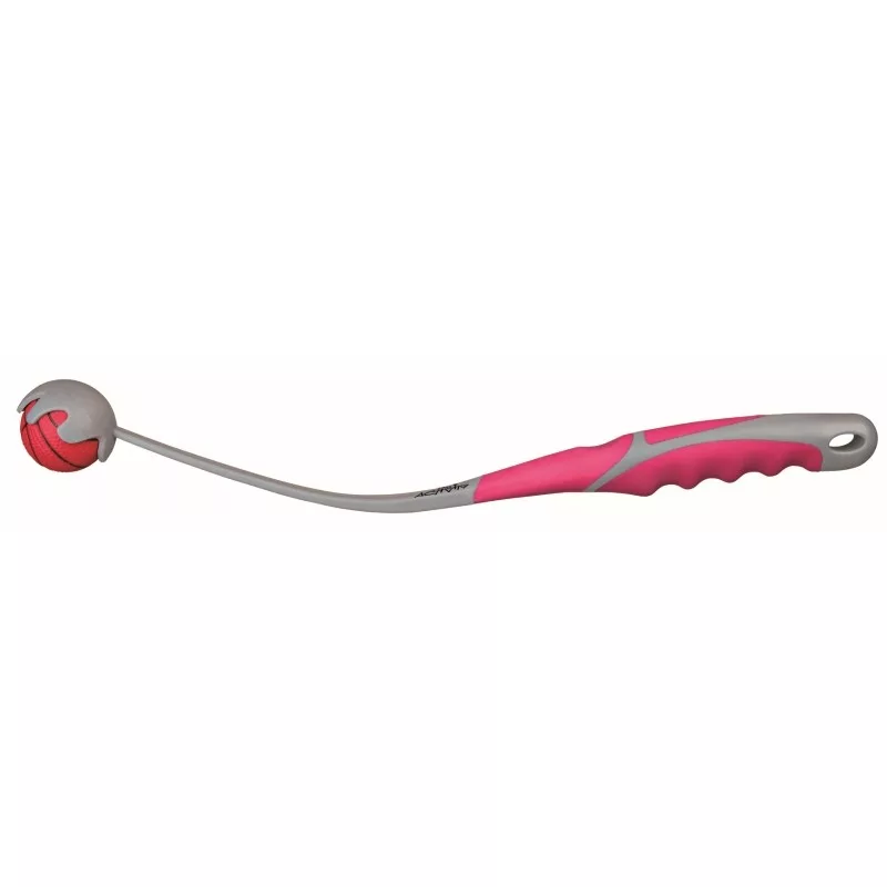 Műanyag nyéllel ellátott labdadobó "katapult" kutyák számára. Helyes használatával könnyedén dobhatunk 2x -3x akkorát melyet kézzel megerőltetve sikerülne. A labda anyaga habosított gumi, elsősorban apportozáshoz ajánlott. Rágós kutyák előtt ne hagyjuk őrizetlenül.