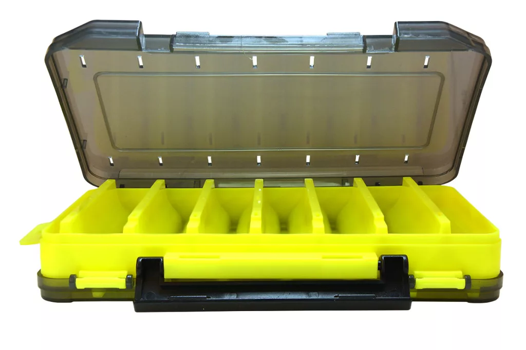 Az erős, ütésálló műanyagból készült doboz hosszú távon is megbízható védelmet nyújt a felszerelésnek. A füstszínű, átlátszó fedél lehetővé teszi a tartalom gyors áttekintését, míg az élénk sárga belső rekeszek segítik a csalik könnyű azonosítását. A fix rekeszes kialakítás biztosítja, hogy a műcsalik elkülönítve, rendezetten maradjanak szállítás közben is.
