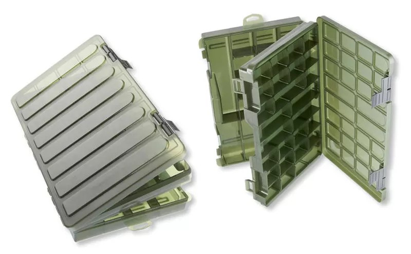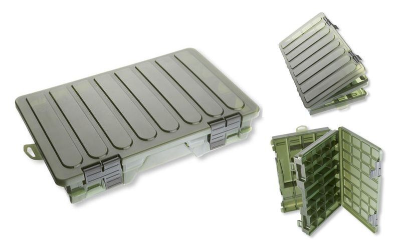 Kétoldalas, tágas műcsalis doboz. 8 hosszú rekesz a felső szekcióban, melyek 28 részre oszthatók.