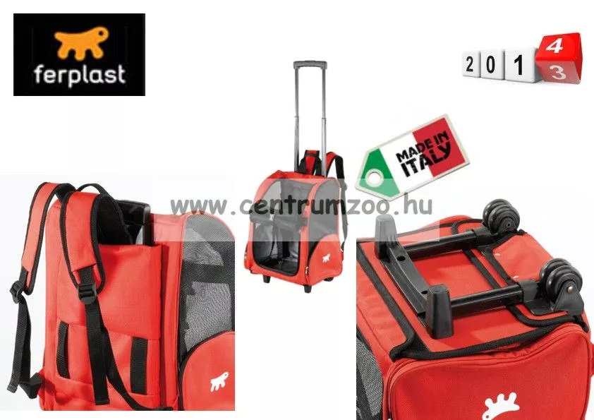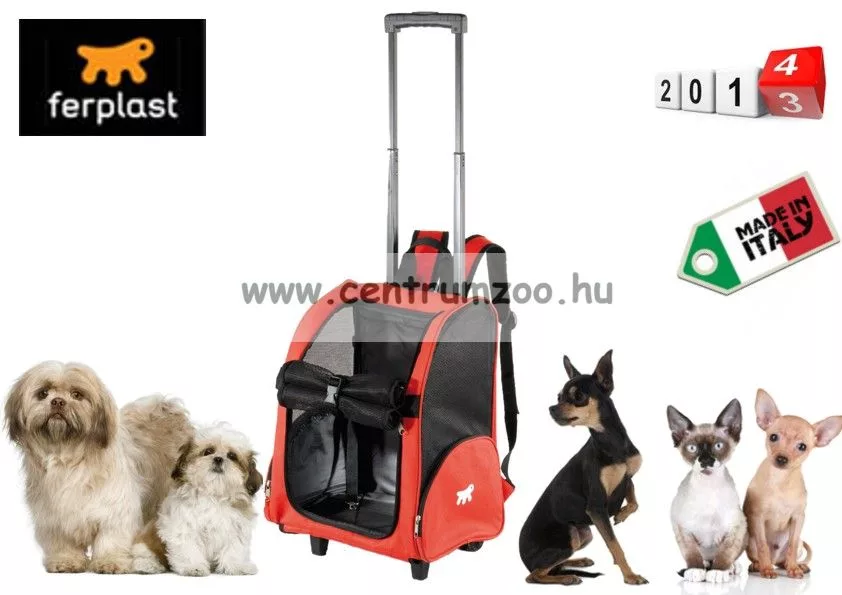 Sok-sok zsebbel ellátott, jól szellőző, masszív szállító kocsi az olasz Ferplast cég fejlesztése. Strapabíró kerekek, kihúzható, kényelmes fogantyú, zárható, jól szellőző, ablakos rekesz biztosítja mind a gazda, mind a szállított kedvencünk kényelmét.
